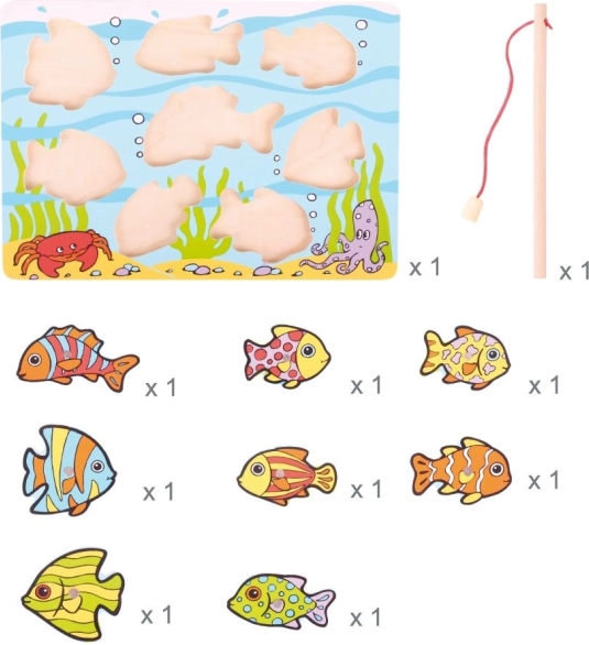 Divertido juego de madera para los más pequeños, donde los niños usan una caña magnética para pescar pececitos de colores y devolverlos a los orificios correctos. Fomenta la motricidad fina, la coordinación ojo–mano y la concentración. Fabricado en madera de calidad de fuentes responsables, cumple con las normas europeas de seguridad. El paquete incluye 10 piezas.