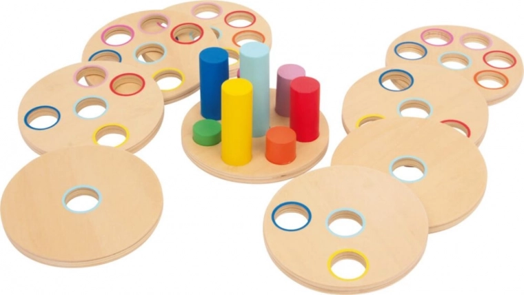 Los discos, firmes y resistentes, están hechos de contrachapado finamente lijado. Gracias a las diferentes longitudes de las varillas y al número de orificios en los discos, el juguete se convierte de forma natural en un reto para los pequeños pensadores.