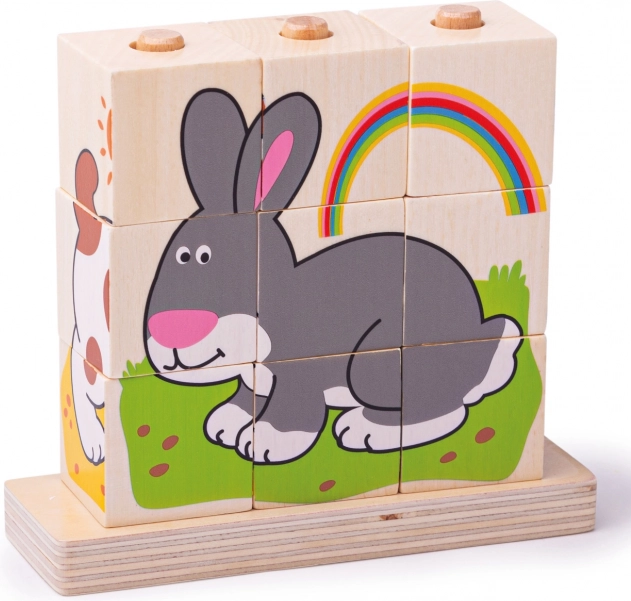 El set incluye un total de 10 piezas: 9 cubos que forman 4 imágenes diferentes, y una base de madera con varillas para un montaje seguro y ordenado. El juguete está hecho de madera duradera con superficie lisa y cumple con las normas europeas de seguridad vigentes.