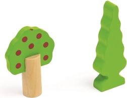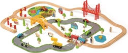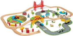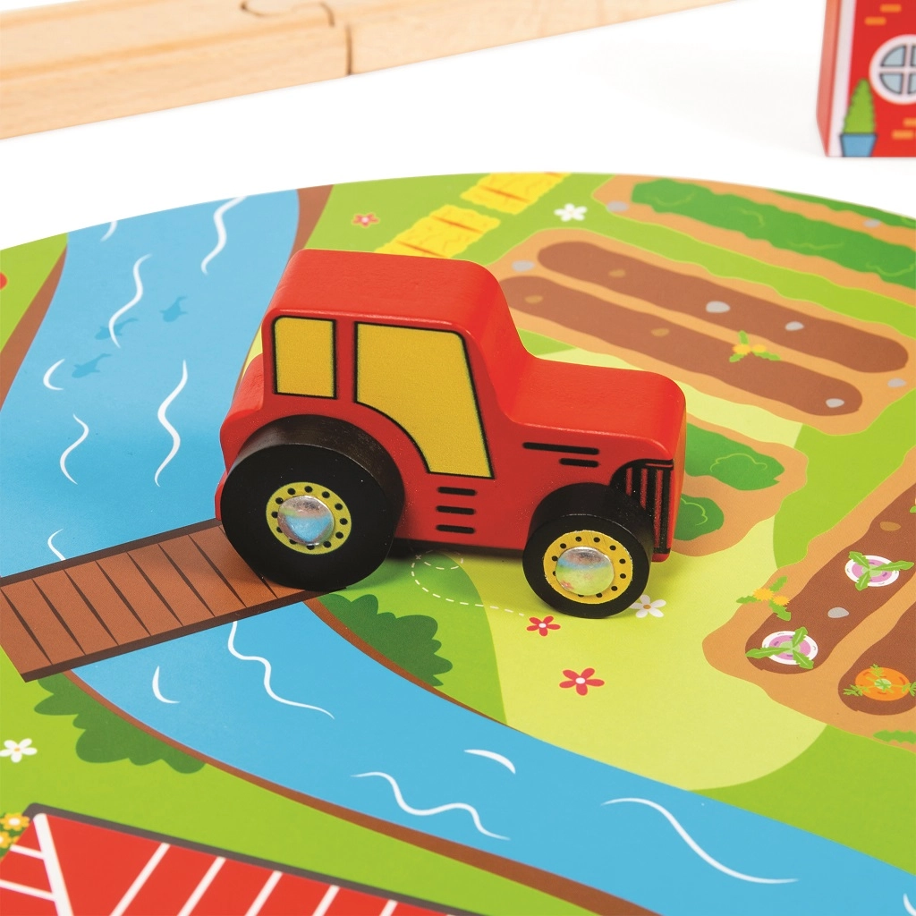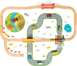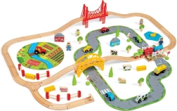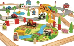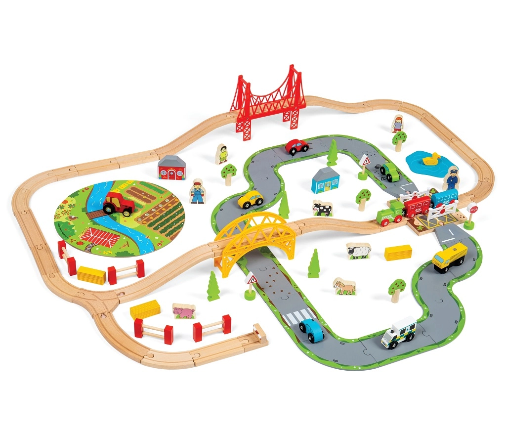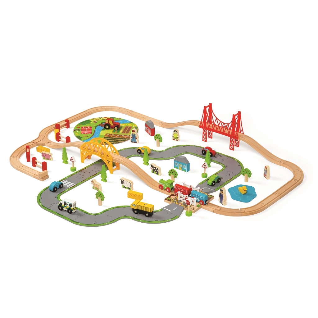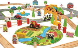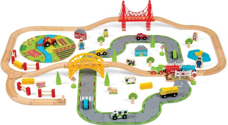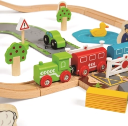 Este ferrocarril de madera con camino rural es la combinación perfecta de ferrocarril y pista de coches, que imitan el mundo real del transporte. Gracias a los puentes y pasos a nivel, tus hijos se adentrarán en un mundo lleno de aventuras divertidas. Todo se complementa con accesorios locales como una granja, edificios y árboles, que embellecen el entorno.