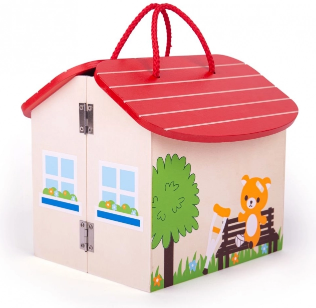 El set con forma de casita y asa es ideal para transportar y guardar de forma segura todos los elementos de juego.