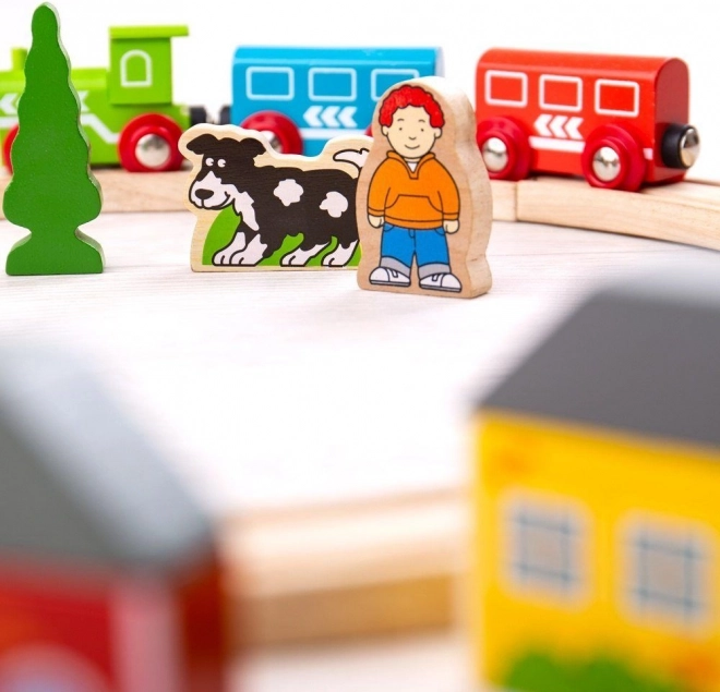 - 8× vías de madera, 1× locomotora, 2× vagón con acoples magnéticos, 8× accesorios (casas, árboles, figuras)