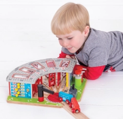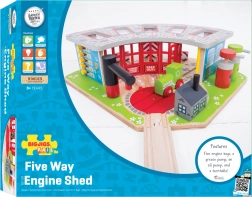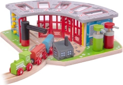 El depósito de madera está diseñado para cinco trenes diferentes e incluye una plataforma giratoria funcional, que permite mover fácilmente los trenes entre los distintos garajes. El sistema cuenta con puertas abatibles y una estación de servicio, lo que contribuye a una experiencia de juego realista.