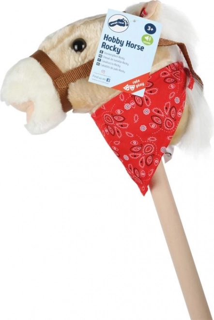 El caballito con palo Rocky está equipado con un botón en la oreja que, al presionarlo, emite un relincho realista, lo que añade autenticidad al juego.
