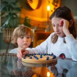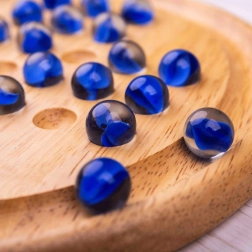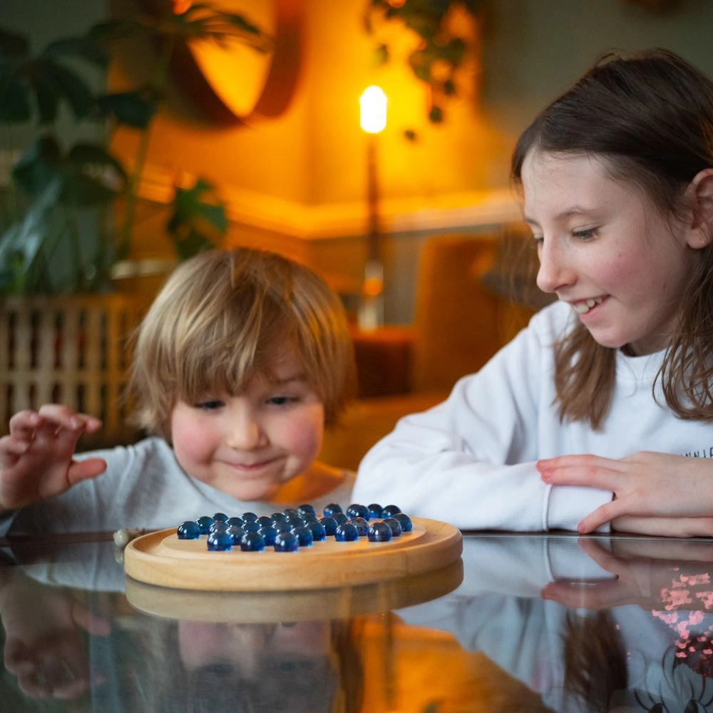 El tablero circular de madera lisa y las brillantes canicas de vidrio garantizan una agradable sensación de juego y una larga durabilidad.