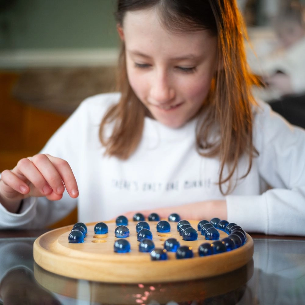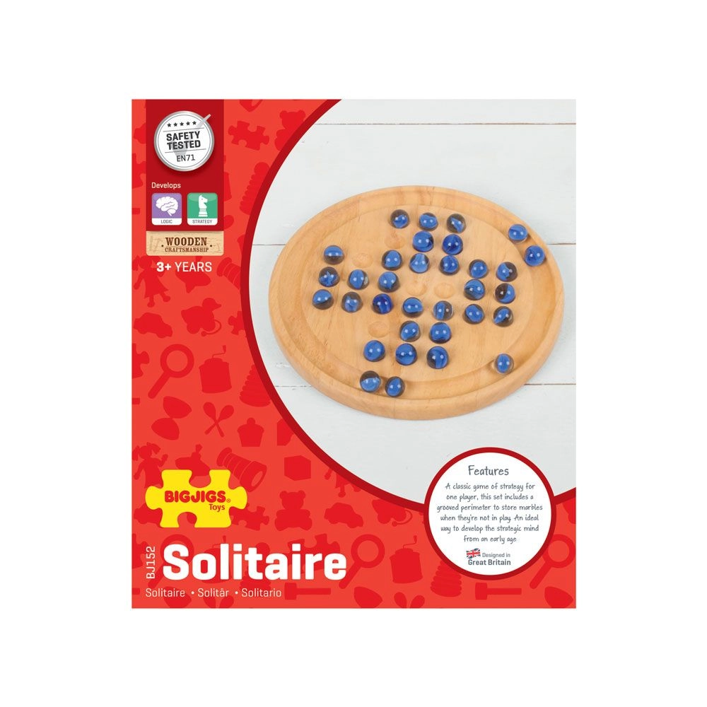 Descubre la diversión atemporal con el solitario de madera BIGJIGS TOYS. Las relucientes canicas azules y el tablero circular cuidadosamente trabajado crean un elegante juego de lógica que pondrá a prueba tu ingenio y tu paciencia. El objetivo es, saltando canicas una sobre otra, dejar una sola canica en el tablero.