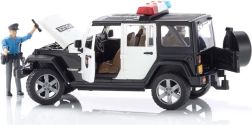 Modelo realista BRUDER Jeep Wrangler Rubicon en versión policial que ofrece a los niños una diversión de primera y un acabado detallado. Incluye puertas, capó y luneta trasera abatibles, ejes con suspensión, techo desmontable en dos piezas y dirección mediante volante adicional. Contiene una figura de policía con amplio equipamiento y un farBeacon funcional con 4 sonidos para un juego aún más realista.