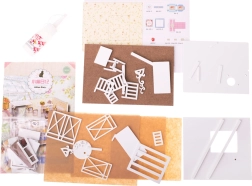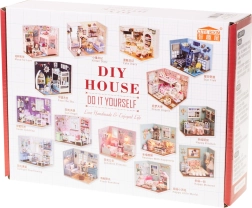 El paquete incluye todo lo necesario: piezas de construcción de la habitación, elementos de mobiliario y decoración, pegamento e instrucciones detalladas con imágenes. La iluminación funciona con 2× AAA 1,5 V y 3× LR54 1,5 V (pilas no incluidas). Recomendado desde 8 años. El modelo terminado mide 17,1 × 13 × 11,6 cm; el paquete 25 × 18 × 6 cm.
