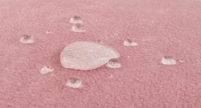 El material CLEANABOO, de tacto aterciopelado, no absorbe inmediatamente los líquidos: las bebidas derramadas quedan en gotas y se limpian fácilmente.
