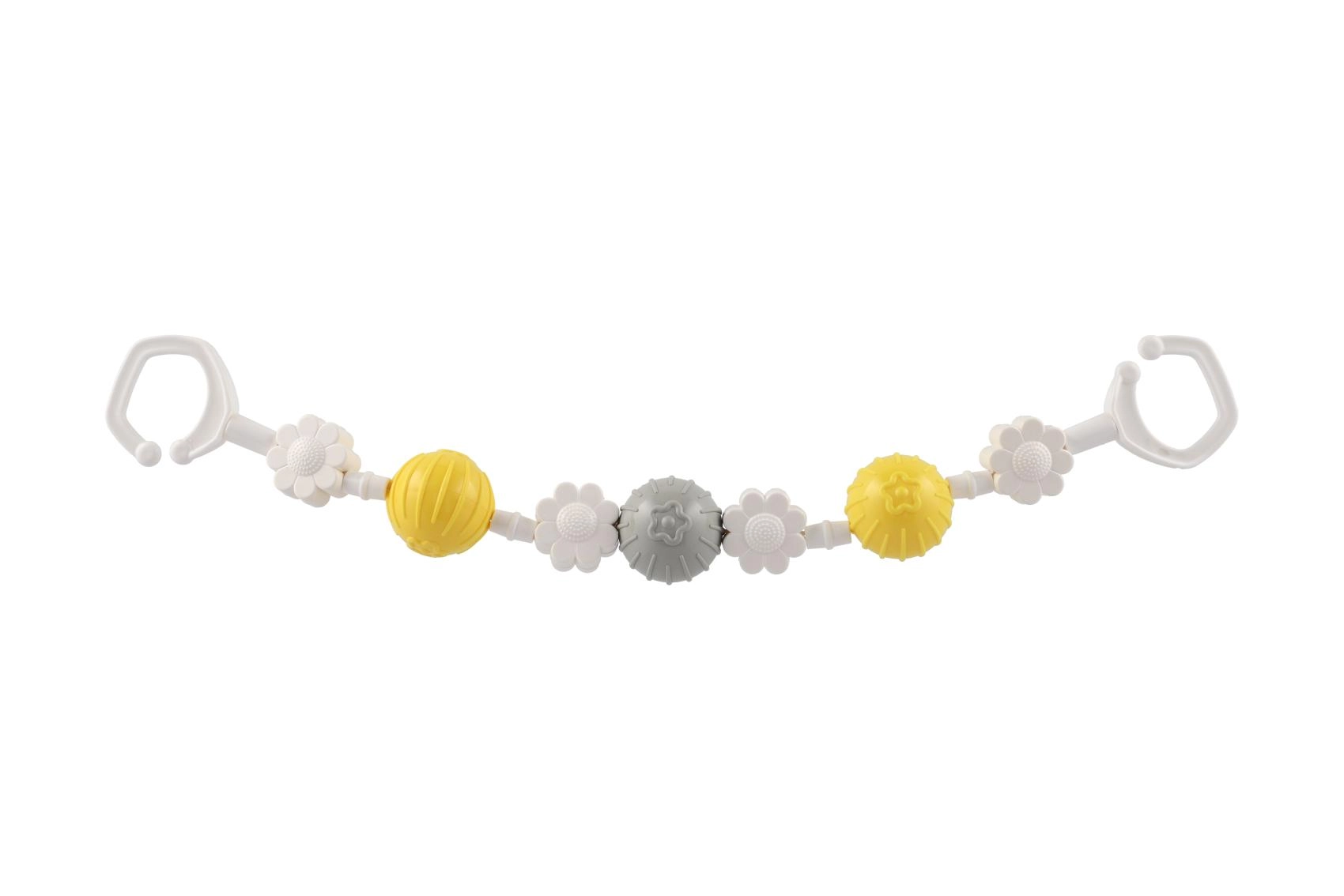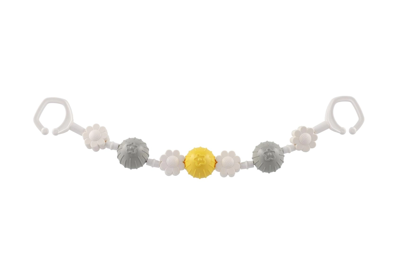 Esta barra colgante universal para cochecito combina bolitas giratorias y formas florales que favorecen el desarrollo de la motricidad fina, la vista y el oído. Las distintas superficies y colores estimulan la curiosidad, mientras que el discreto sonido de sonajero calma y entretiene al bebé durante los paseos.