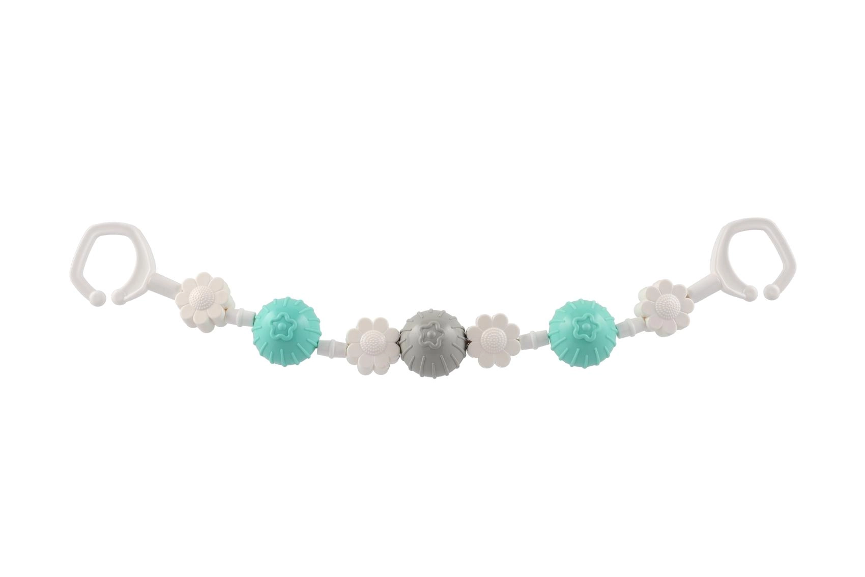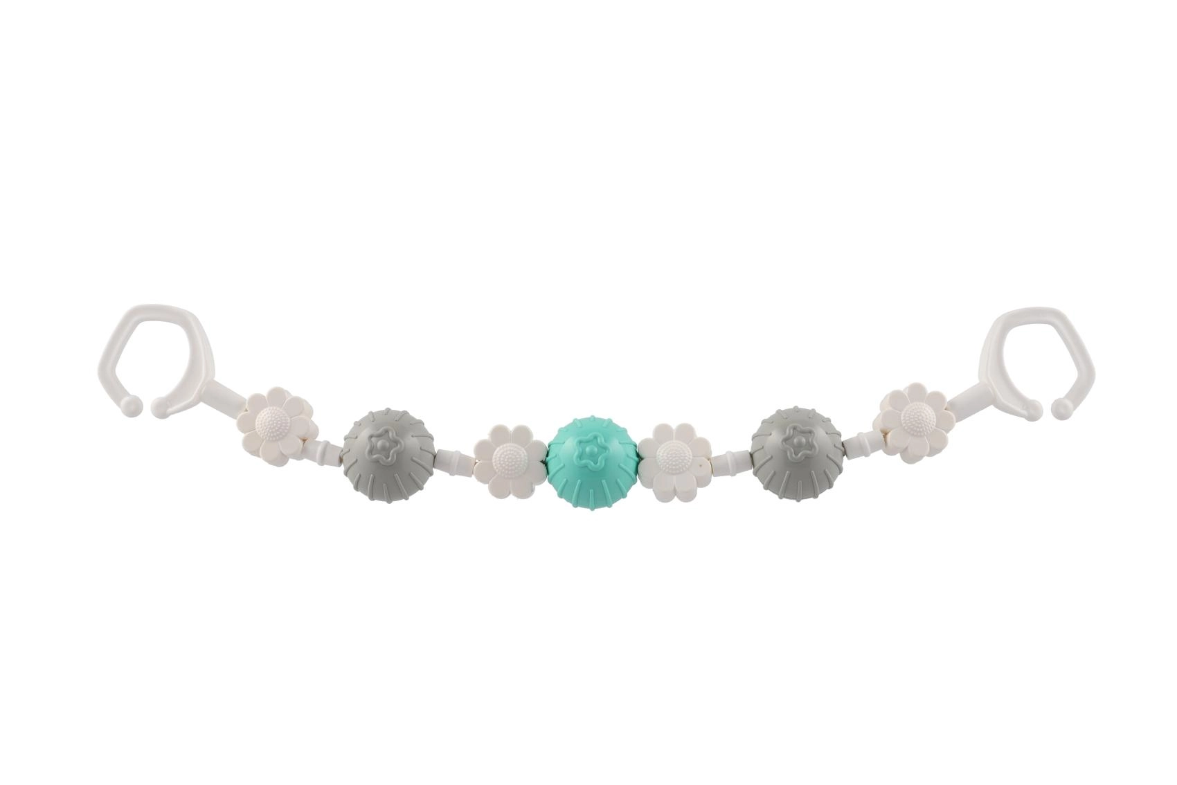 Las flores y bolitas alternas con diferentes texturas estimulan el tacto, la vista y la concentración, motivando al bebé a agarrar y girar.