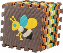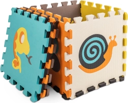 Esta gran alfombra de espuma está compuesta por 9 piezas de 30 × 30 × 1 cm que encajan fácilmente entre sí. Los colores contrastados y los adorables motivos de animales atraen a los niños y estimulan su vista y tacto. Los elementos centrales extraíbles funcionan como un sencillo clasificador: los niños aprenden a reconocer las formas y a colocarlas en el lugar correcto.