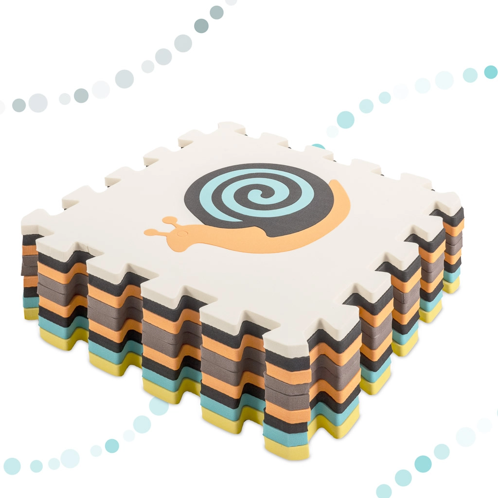 La alfombra está fabricada con espuma EVA de calidad, es antideslizante, impermeable y muy fácil de mantener: basta con pasar un paño húmedo. Con las piezas también se pueden crear estructuras 3D como una pequeña casita o un corralito para delimitar una zona de juego segura.