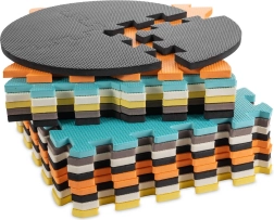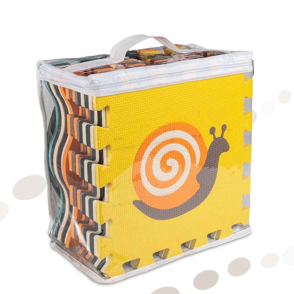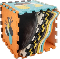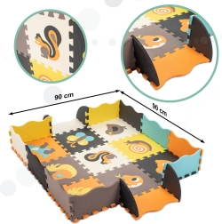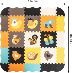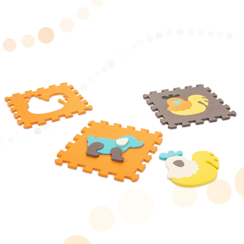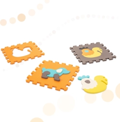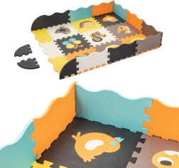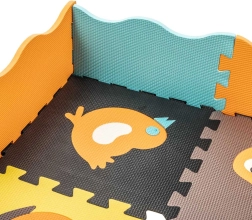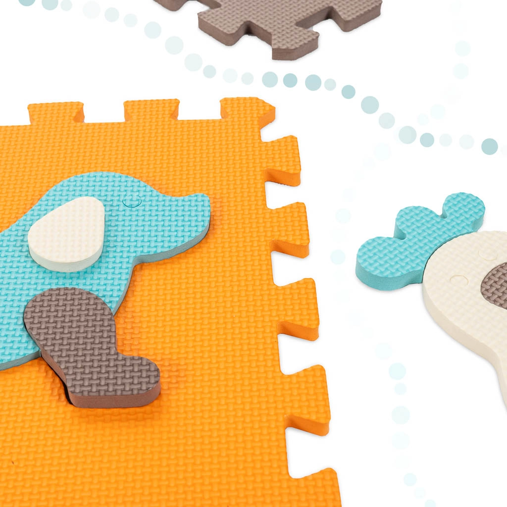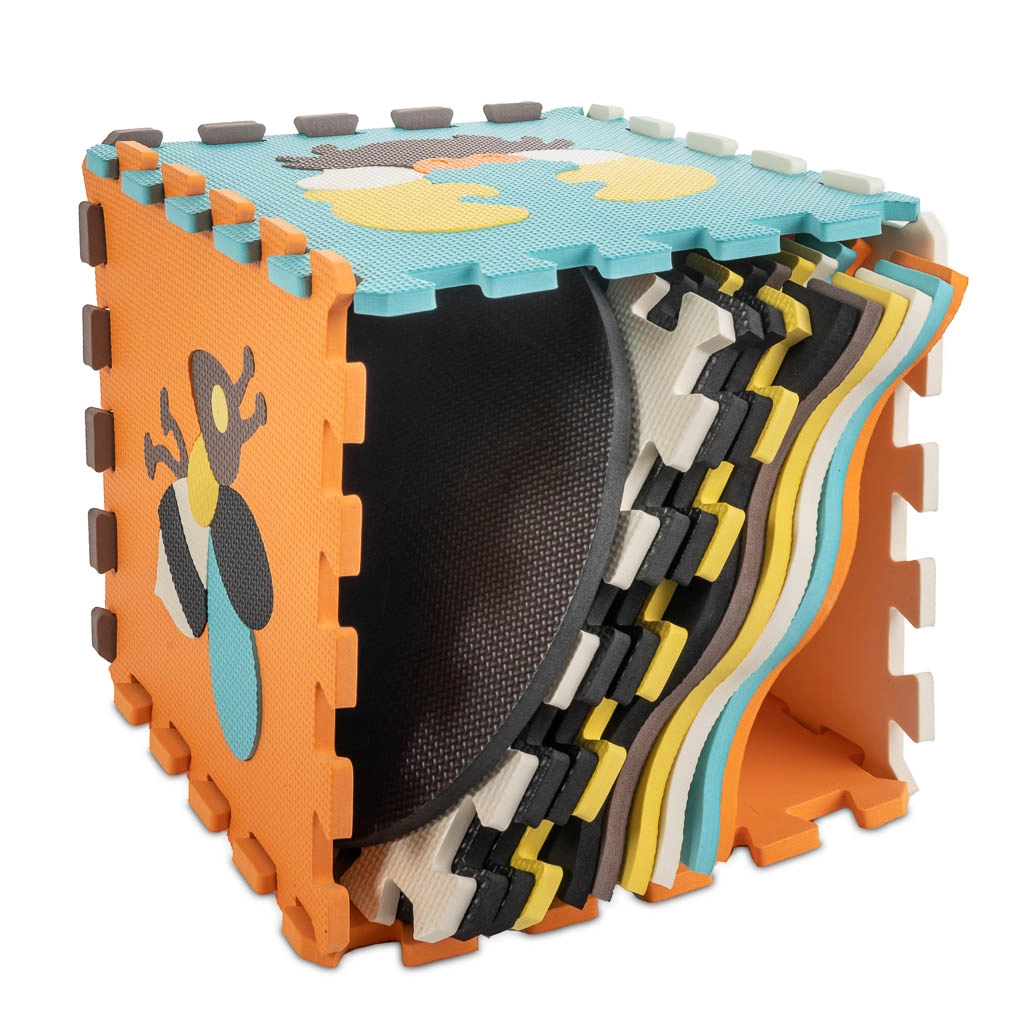 Esta gran alfombra de espuma consta de 25 piezas (9 piezas principales con animalitos extraíbles y 16 marcos perimetrales). Gracias a la textura más rugosa de la superficie y a los colores contrastados, estimula de forma natural la vista y el tacto. La suave espuma EVA amortigua las caídas en los primeros pasos y protege del frío del suelo.