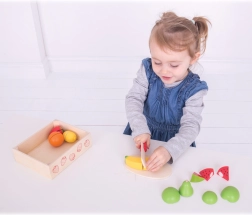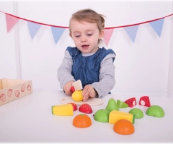 Al “cortar” las piezas de fruta de madera con el cuchillo seguro, los niños entrenan el agarre, la coordinación ojo-mano y la precisión de movimientos.