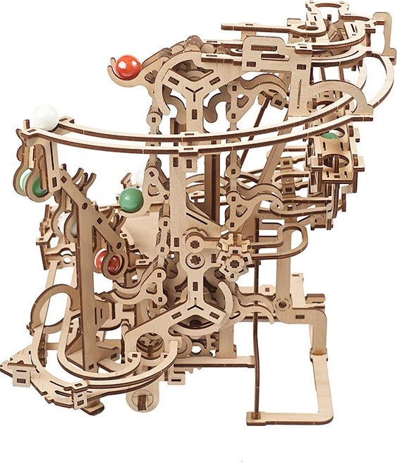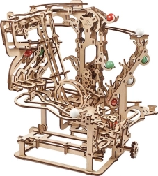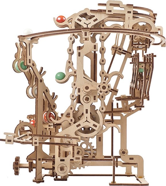 Esta elaborada pista de canicas de contrachapado de alta calidad ofrece una combinación de disfrute modelista, valor educativo y un espectáculo relajante. El elevador de cadena accionado manualmente transporta con fluidez las canicas al inicio, desde donde se lanzan por tres secciones independientes, cada una con un obstáculo principal único. El diseño abierto resalta la mecánica funcional y los detalles finos.