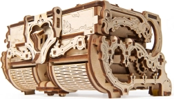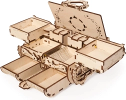 El modelo complacerá tanto a principiantes como a constructores avanzados a partir de 14 años. Con el mantenimiento adecuado (ligero engrase con cera según las instrucciones), el mecanismo funciona de forma suave y duradera. Cerrada, la caja presenta dimensiones compactas; al abrirse, se transforma en un llamativo organizador con varios niveles de almacenamiento.
