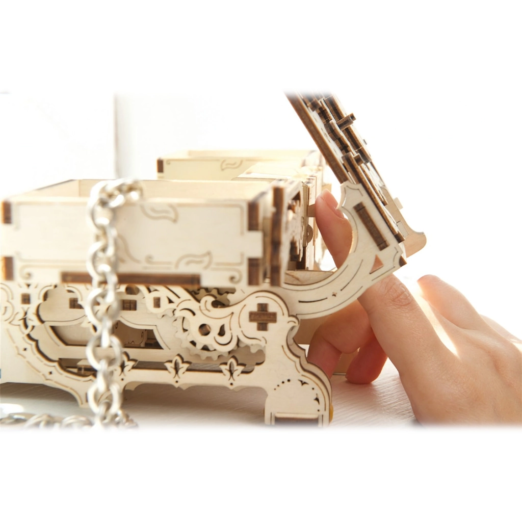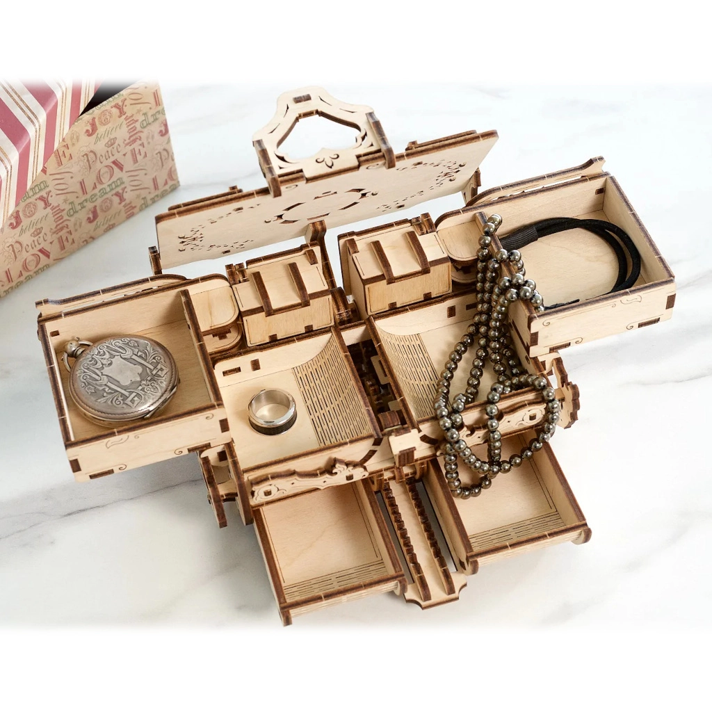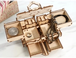 Esta original caja de joyas de estilo antiguo combina corte láser de alta precisión con una mecánica inteligente. Una vez montada, obtendrás una caja funcional con engranajes y piezas móviles que cautiva a primera vista y guarda tus valores de forma segura. La experiencia de montaje es divertida y didáctica: sin pegamento, solo con piezas perfectamente ajustadas de contrachapado de calidad.