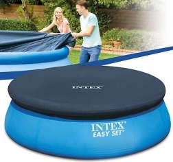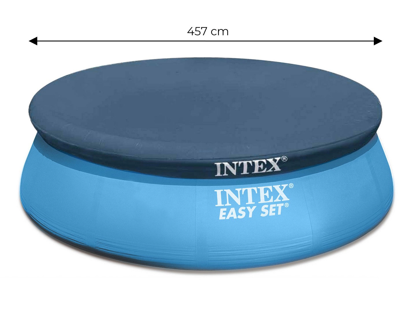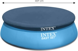Práctico cobertor INTEX para piscinas elevadas redondas de 457 cm de diámetro que protege el agua de hojas, insectos e impurezas. Gracias a los orificios de drenaje, el agua no se acumula en la superficie y la lona ayuda a mantener una temperatura del agua más estable. Está fabricada con material resistente, cuenta con un solape de 30 cm para una sujeción segura y es compatible con piscinas de distintas marcas con ancho de borde de 421 cm.