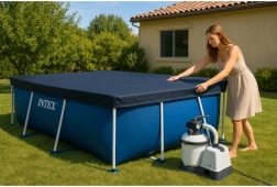 La cubierta INTEX está diseñada para piscinas rectangulares con estructura de 300 × 200 cm. Gracias a su material resistente, soporta las inclemencias del tiempo y ayuda a proteger el agua de hojas, insectos y suciedad. El solape de aprox. 20 cm y el cordón de fijación garantizan una sujeción estable para que la cubierta no se desplace.