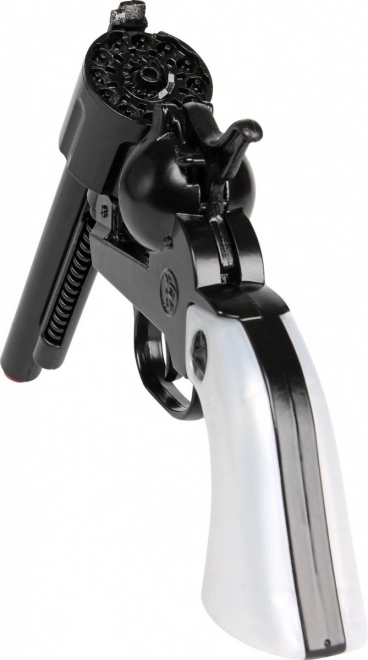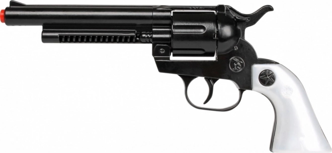 El cuerpo negro, la empuñadura blanca y el cañón largo crean el icónico estilo del revólver del oeste, ideal para juegos y disfraces.