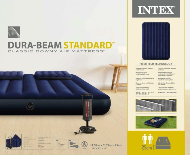 Práctico colchón inflable INTEX para dos personas con dimensiones de 203 × 152 × 25 cm, superficie de terciopelo suave y construcción estable para un sueño cómodo en casa y de viaje. En el paquete encontrarás una bomba de mano de pistón, 2 almohadas inflables y un parche de reparación. Gracias a la válvula Boston, el inflado y desinflado es rápido y sencillo.
