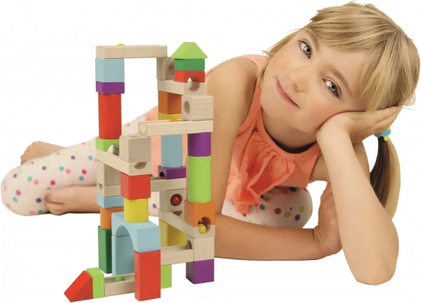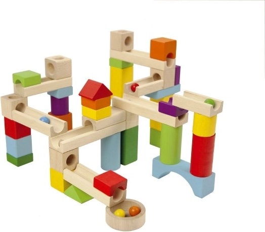 Esta pista de canicas de madera ofrece diferentes recorridos para las canicas, fomentando la creatividad y el desarrollo de habilidades motoras.