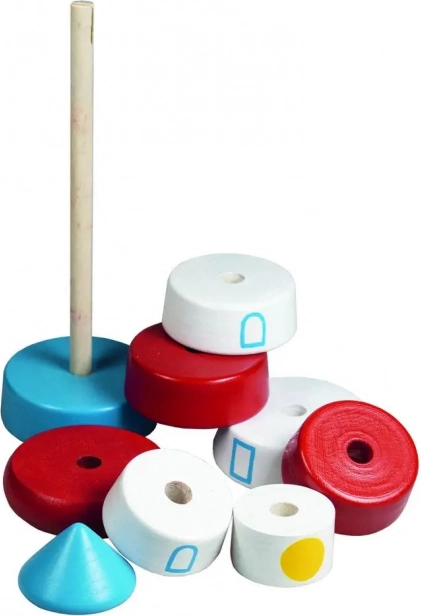 Apilar en el perno entrena la coordinación ojo–mano, la clasificación por forma y tamaño y la percepción de los colores. Juguete didáctico ideal como primera opción para los más pequeños.