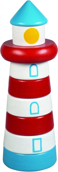 El faro de madera como pirámide apilable invita a los niños a colocar las piezas en el perno según su forma y tamaño. El juego apoya de forma intuitiva la coordinación ojo–mano, la paciencia y la percepción de colores y formas, y además estimula agradablemente el tacto gracias a su superficie lisa.