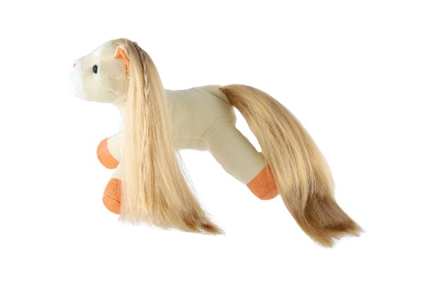 Este bolso de peluche naranja oculta en su interior un adorable caballito que se puede sacar y volver a guardar en cualquier momento. La melena larga y suave invita a peinar y trenzar, fomentando la motricidad fina y la creatividad.