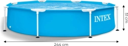 Disfruta del verano con la compacta piscina de jardín INTEX Metal Frame 244 × 51 cm. Su estructura de acero estable, el resistente material de PVC de tres capas con refuerzo de nailon y el montaje rápido en 30 minutos hacen de esta piscina circular una opción ideal para familias. Ofrece un volumen de 1 828 l, posibilidad de conectar una bomba de filtración y válvula para un vaciado sencillo.