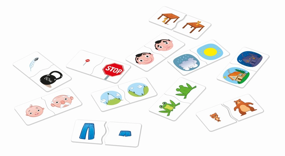 Divertido juego educativo para los más pequeños que enseña a los niños a comprender los opuestos mediante grandes tarjetas de dos piezas. Gracias a la forma única del encaje, los niños reconocen de inmediato si han encontrado la pareja correcta. Desarrolla el vocabulario, el razonamiento lógico, la atención y la motricidad fina.