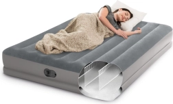 Disfruta de la comodidad en cualquier lugar: este colchón inflable doble INTEX es perfecto como cama temporal para invitados, para viajar o para acampar. El PVC resistente con una agradable superficie de terciopelo evita que la sábana se deslice y aumenta el confort. Gracias a su cuidada estructura interna, el colchón mantiene la forma, no se hunde y proporciona soporte estable para la columna.