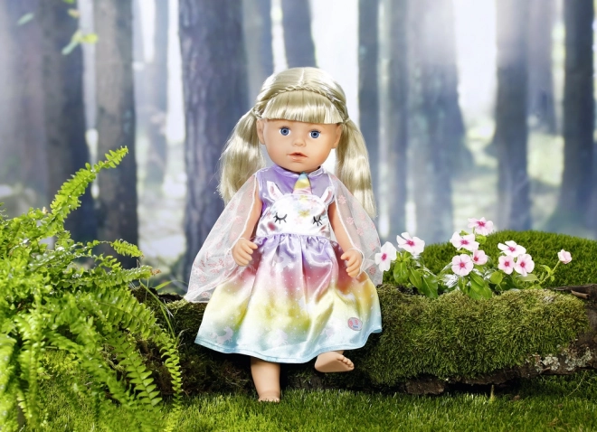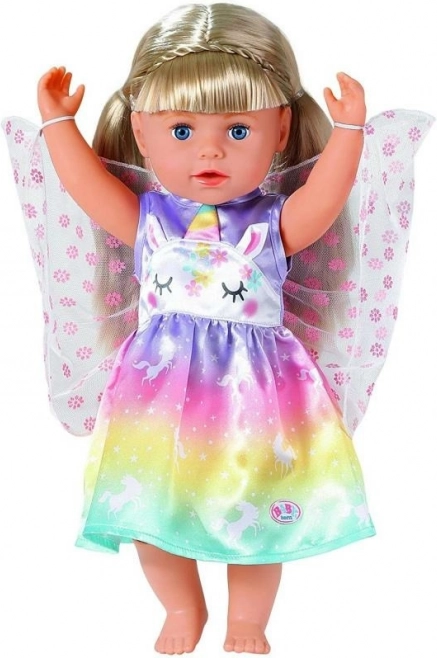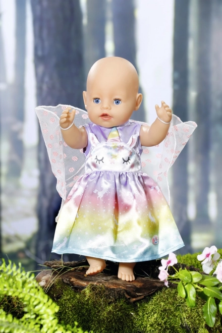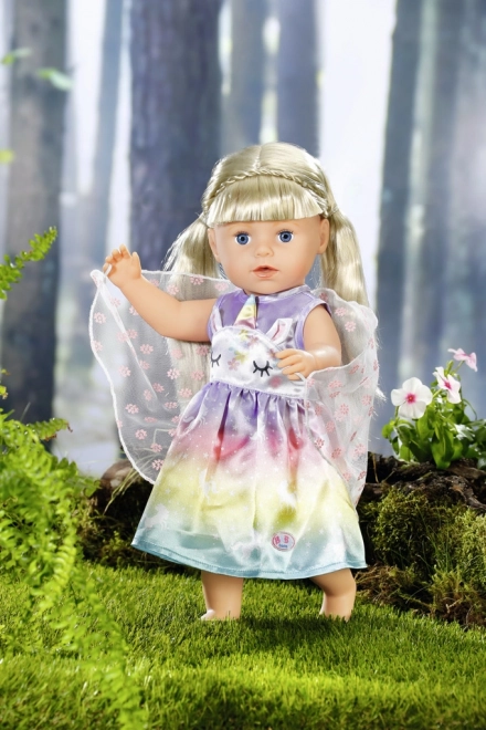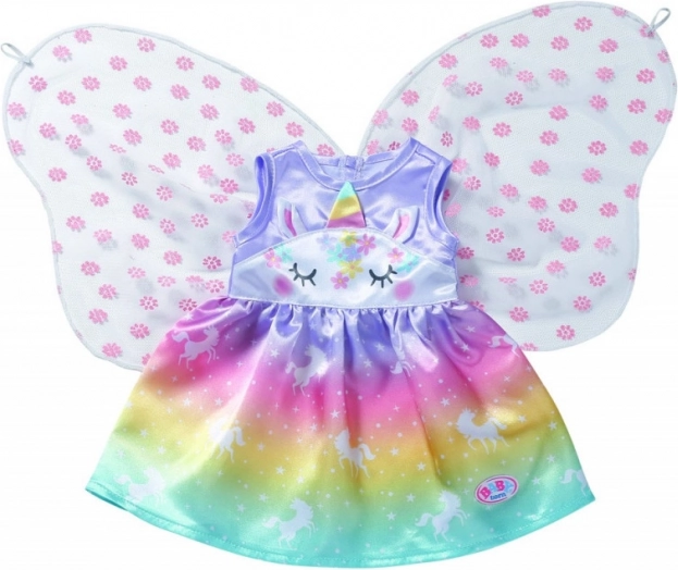 Convierte cada juego en una aventura de cuento. Este vestido para la muñeca BABY born de 43 cm (apto también para 39–46 cm) brilla con un degradado arcoíris, motivos de unicornios y delicadas alas. Gracias a los materiales de calidad, resiste muchas sesiones de cambio de ropa, fiestas de té y desfiles reales.