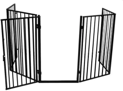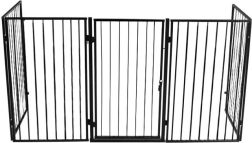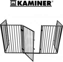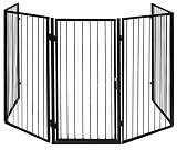 Práctica barrera de seguridad para chimenea que protege a niños y mascotas del contacto con superficies calientes y del fuego abierto. Gracias a sus cinco segmentos con bisagras, se adapta fácilmente al espacio, cuenta con fácil montaje a la pared, bloqueo de seguridad contra aperturas accidentales y es compatible con la mayoría de las chimeneas. Estructura robusta de acero en color negro, con un ancho total de 304 cm y una altura de 74,5 cm, que proporciona una protección fiable en el salón.