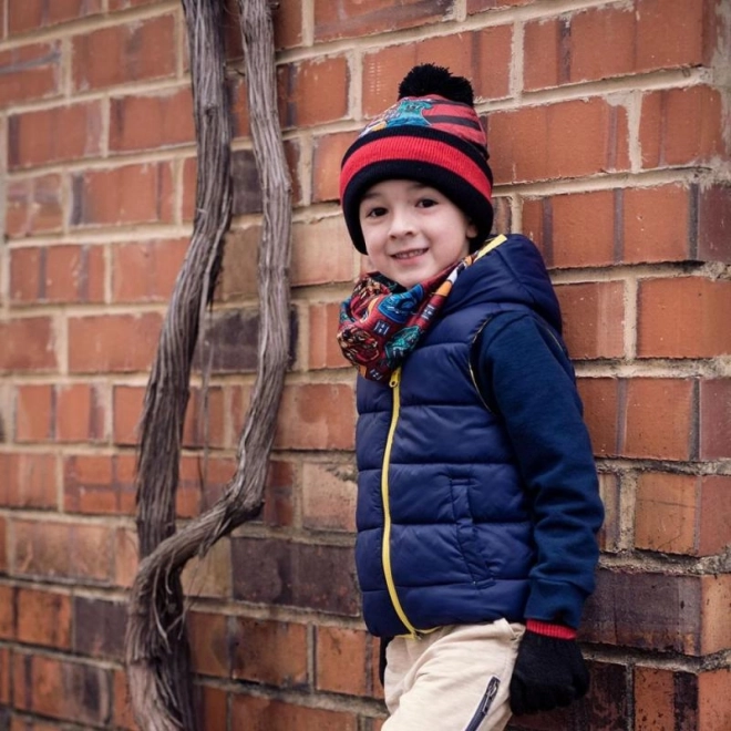 Gorro de punto en diseño rojo y negro con el llamativo emblema de Hogwarts y un suave pompón que mantiene la cabeza y las orejas abrigadas y aporta un toque de estilo mágico al conjunto.