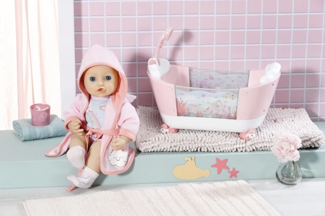 Deja que tu Baby Annabell viva momentos mágicos con este elegante albornoz y pijama. El albornoz está adornado con alas, lo que lo convierte no solo en un complemento a la moda, sino también en un accesorio cómodo para el juego. Debajo del albornoz, la muñeca lleva un pelele corto con el estampado de una ovejita disfrutando de una ducha arcoíris. Para que los piececitos de la muñeca estén bien calentitos, el conjunto también incluye calcetines rosas con imágenes de alas.