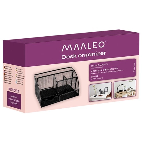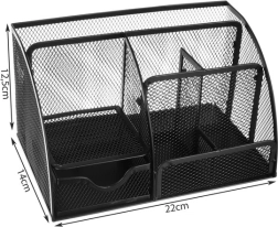 Mantén tu escritorio en orden con el compacto y resistente organizador de escritorio de malla metálica en elegante color negro. Ofrece 6 compartimentos, un práctico cajón extraíble y una distribución inteligente para lápices, rotuladores, notas adhesivas, clips y tijeras: ideal para la oficina, el despacho en casa y el estudio.
