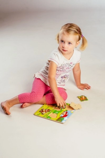 Cada pieza del rompecabezas cuenta con una pequeña agarradera de madera, gracias a la cual los niños practican fácilmente el agarre y la colocación de las piezas en el lugar correcto.