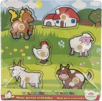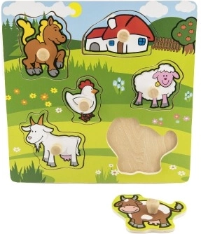 Este rompecabezas incluye un total de 5 animales de colores, entre ellos un caballito, una cabra, una ovejita, una gallinita y una vaca, que son fáciles de agarrar gracias a las pequeñas agarraderas de madera. Cada pieza tiene su lugar en la base de madera, lo que también ayuda a los niños a aprender a colocar cada pieza correctamente.