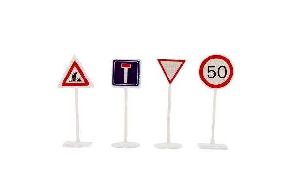 El paquete contiene una variada selección de señales: desde Stop, pasando por vía principal y secundaria, prohibiciones y obligaciones, hasta triángulos de advertencia y símbolos informativos. Gracias al plástico resistente, son aptas para el juego diario y se recogen fácilmente.