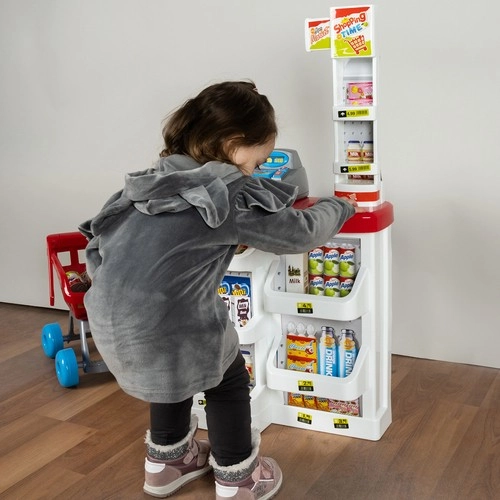 El supermercado infantil es ideal para pequeños vendedores y clientes. Incluye una caja registradora funcional con cajón extraíble, escáner de códigos de barras con sonido, báscula de tienda, estantes con productos y un carrito de compras. Gracias al completo equipamiento, los niños practican cálculo, comunicación y autonomía.
