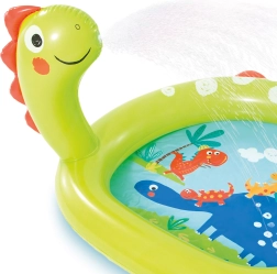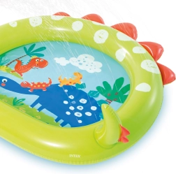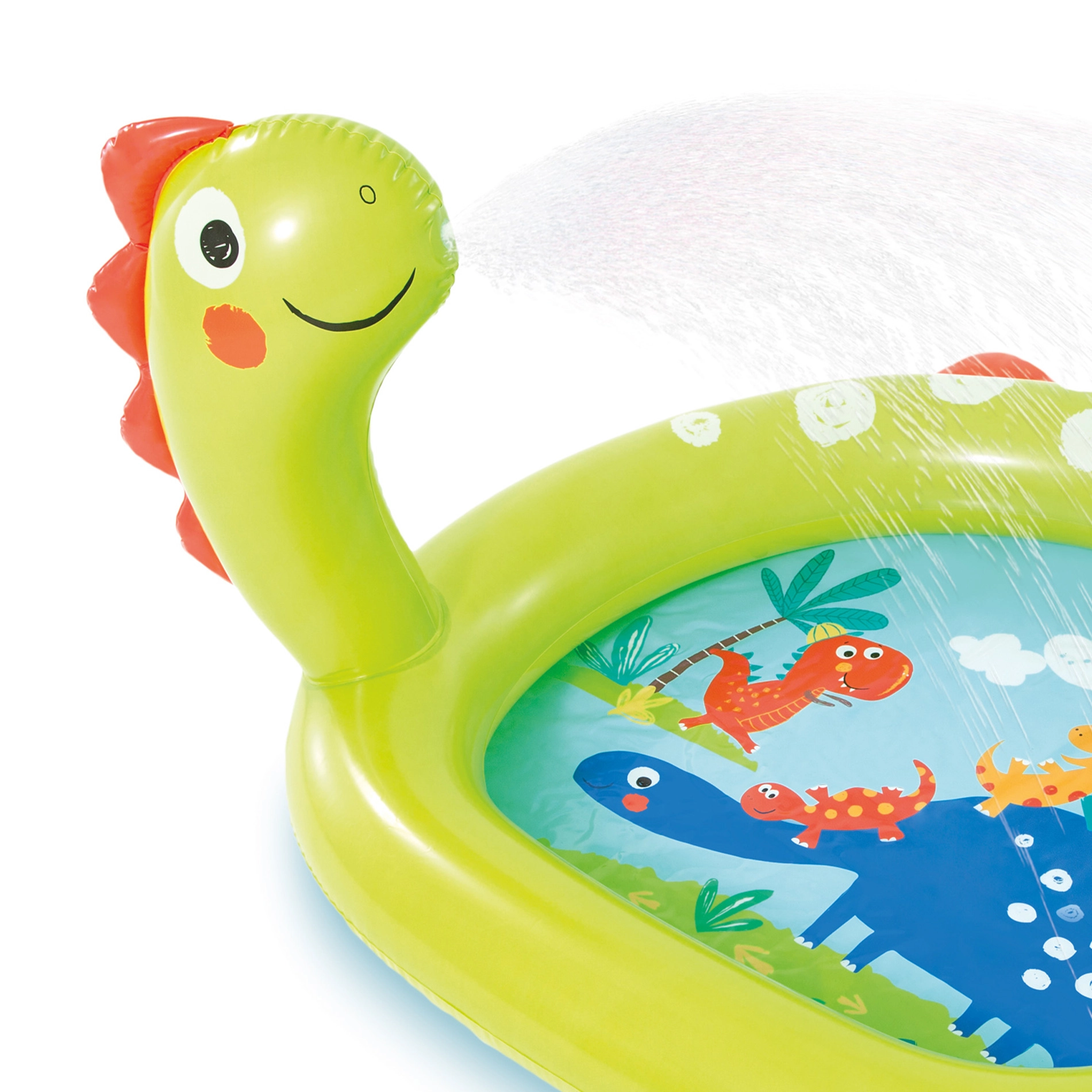 Alegre piscina inflable con fuente y diseño de dinosaurio, ideal para la diversión veraniega en el jardín. La piscina está hecha de material PVC de alta calidad y mide 119 x 109 x 66 cm.
