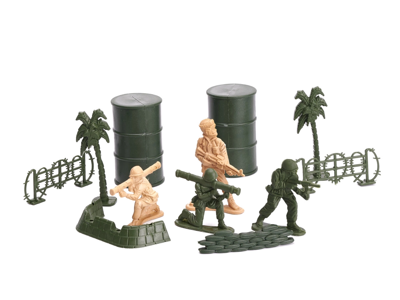Incluye alrededor de 60 figuras de soldados en diferentes posiciones y abundantes componentes para construir una base militar: barriles, vallas, obstáculos, palmeras y más. Las figuras miden aprox. 5 cm de altura, se mantienen estables sobre superficies planas y se distribuyen con facilidad.