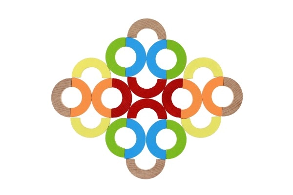 Este versátil mosaico de madera ofrece posibilidades de juego infinitas: desde construir torres y puentes hasta crear patrones simétricos y realizar tareas de equilibrio. Las piezas robustas y suavemente lijadas, en colores vivos, invitan a explorar y ayudan a los niños a aprender concentración y coordinación ojo-mano.