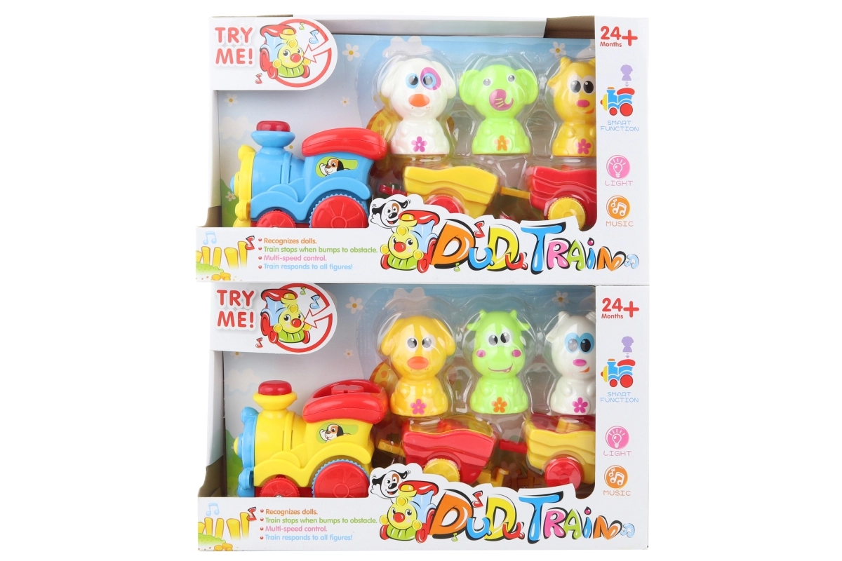 Este colorido tren infantil con animalitos es ideal para pequeños exploradores. Se mueve, toca la bocina, reproduce música y los animalitos se mueven mientras avanza. Presionando uno de los animalitos se puede cambiar la velocidad del trenecito.