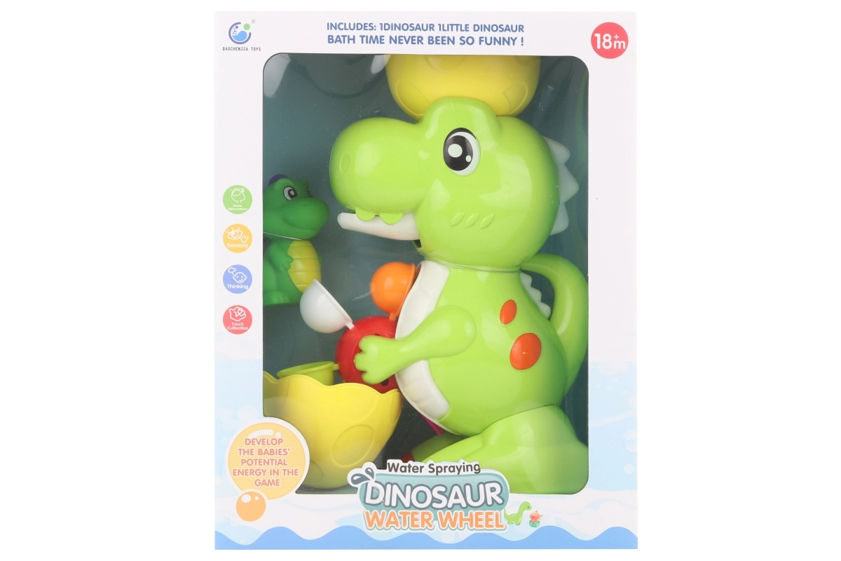 Anima la hora del baño de los niños con este alegre molino de agua con forma de dinosaurio. Gracias a las ventosas se fija fácilmente a la pared de la bañera o a los azulejos, y el agua hace girar las paletas para divertidos juegos acuáticos. Ideal para niños a partir de 18 meses, con dimensiones del dinosaurio de aprox. 15 × 24 × 8 cm y una práctica fijación sobre superficies lisas.