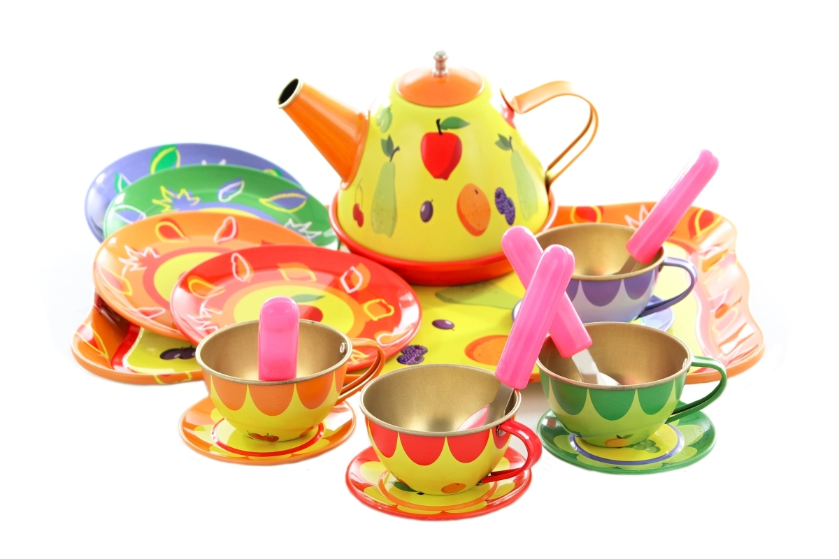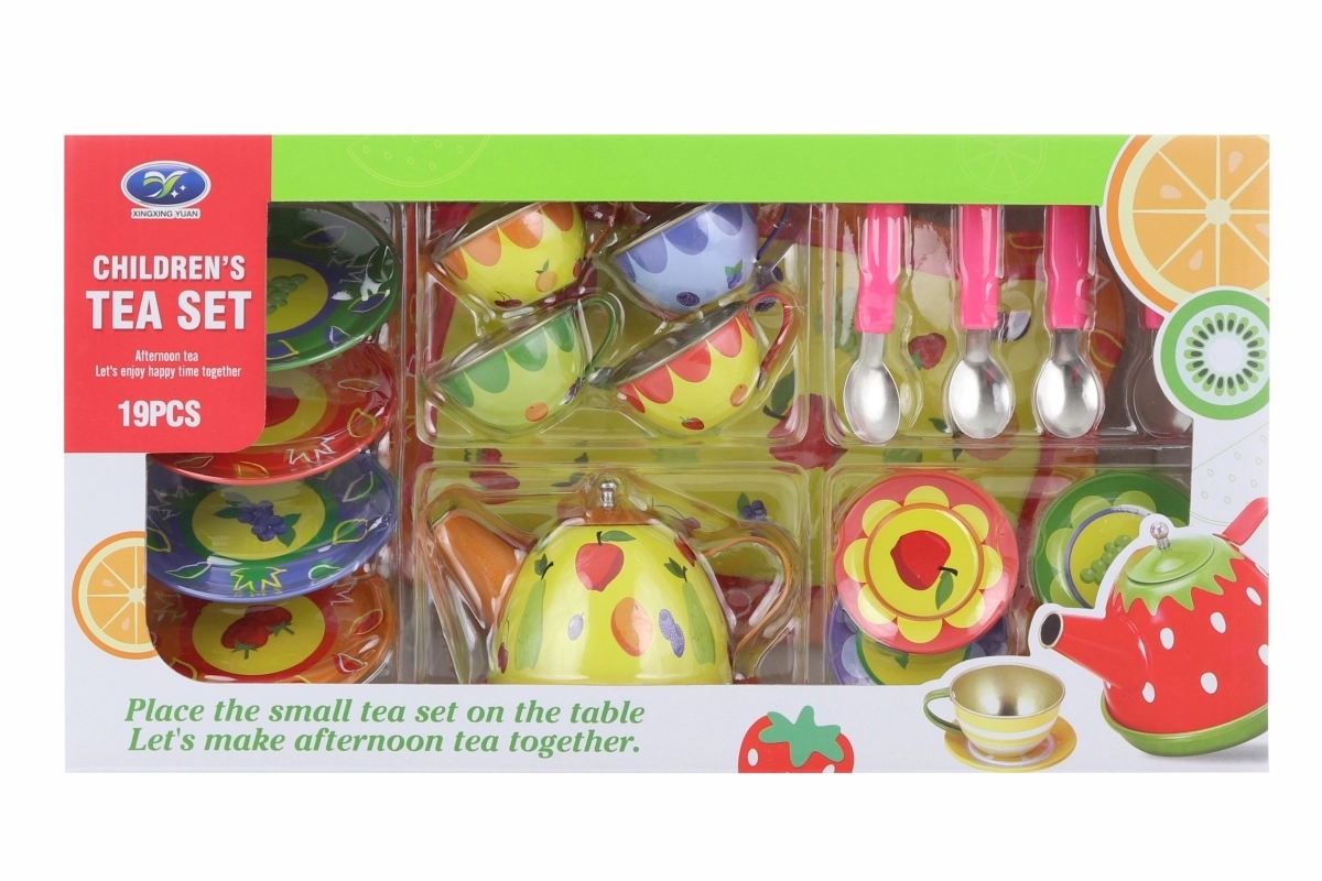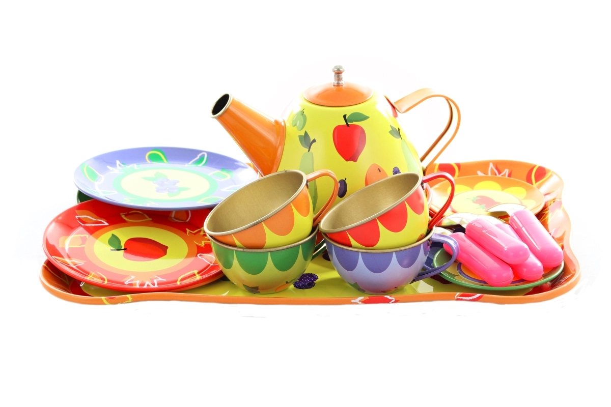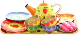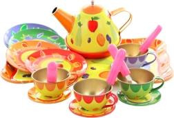 Ilumina la tarde de los peques con este colorido juego de té de hojalata para pequeños anfitriones. El set incluye tetera, bandeja, tazas, platillos, platos y cucharitas, todo con alegres motivos frutales y florales. La resistente fabricación en metal es ideal para jugar a la hora del té, fomentando la imaginación, el juego de roles y la interacción social. Apto para niños a partir de 3 años.