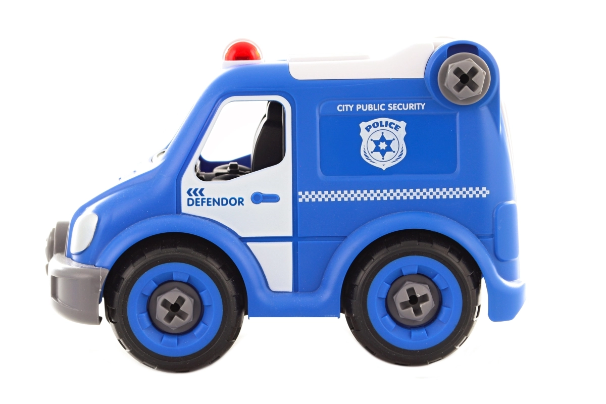 Gracias al atornillado fácil, el modelo es ideal para pequeños mecánicos. Plástico de calidad, piezas desmontables (p. ej., ruedas y parachoques) y un marcado aspecto policial garantizan una larga durabilidad y un aspecto atractivo.