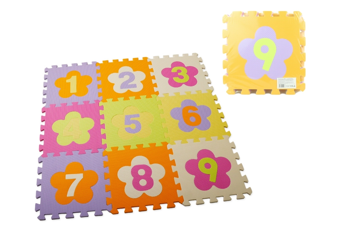 Coloridos puzzles de espuma con cifras y piezas extraíbles crean una alfombra de juego suave y segura para niños a partir de 3 años. Las piezas de 28 × 28 cm se conectan fácilmente, tienen superficie acanalada antideslizante, son lavables, amortiguan el ruido y aislan del frío. El paquete incluye 9 piezas cuadradas.